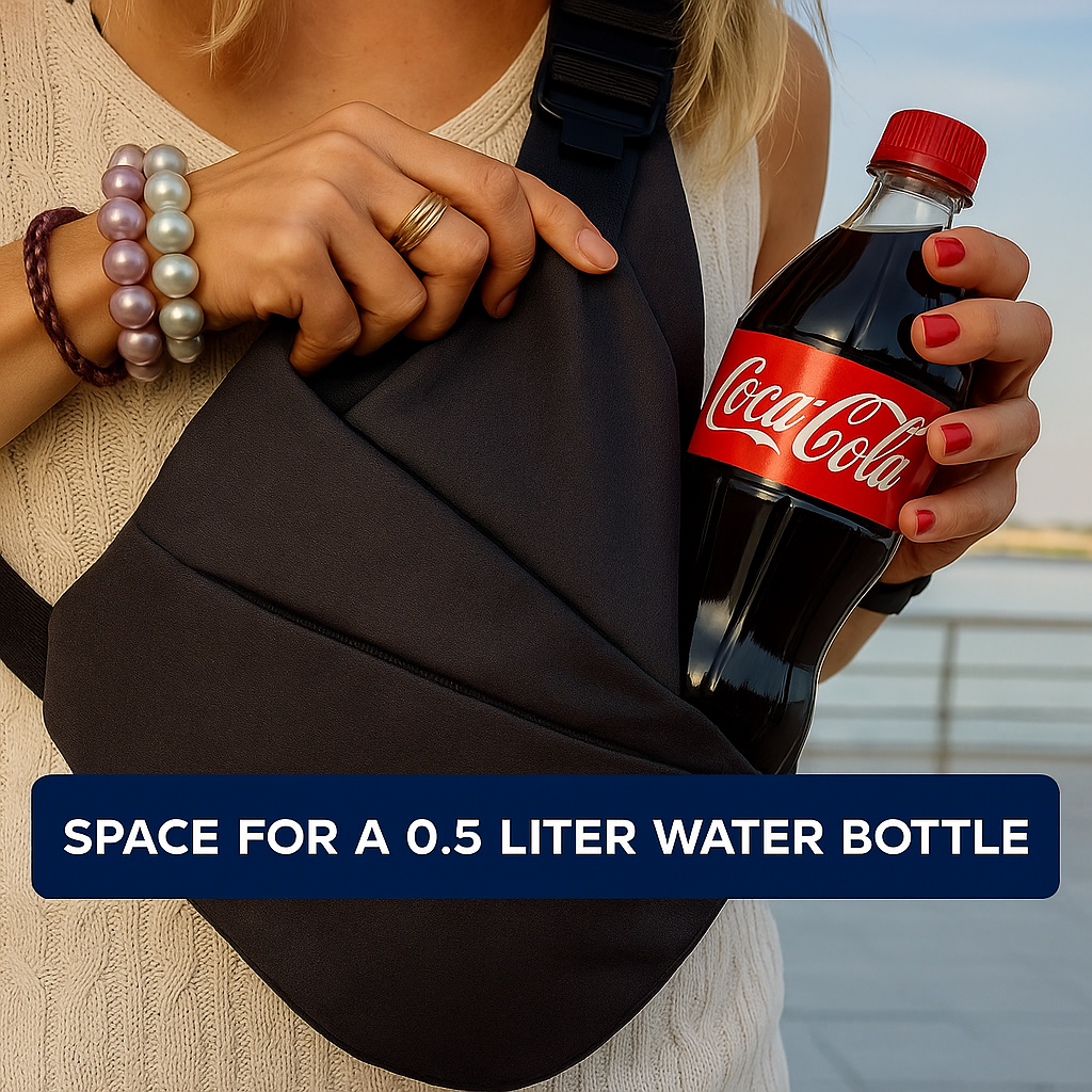 It has 4 compartments — one magnetic phone pocket, two front pockets, and a main compartment with a hidden pocket. It can fit everything from your passport, phone, wallet, keys — even a Kindle or tablet up to the size of 30 × 20 × 4 cm.